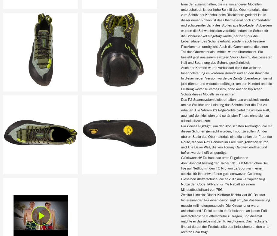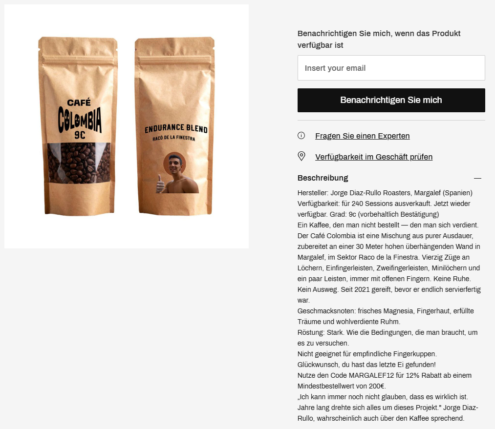 Der letzte Hinweis handelte von einem Kletterer, der 240 Sessions gebraucht hatte, um sein Lieblingsheißgetränk zu bestellen. Die Lösung war im Menü unserer Website versteckt: eine gefälschte Produktseite, die dem Café Colombia gewidmet war, dem 9c von Jorge Diaz-Rullo in Margalef.