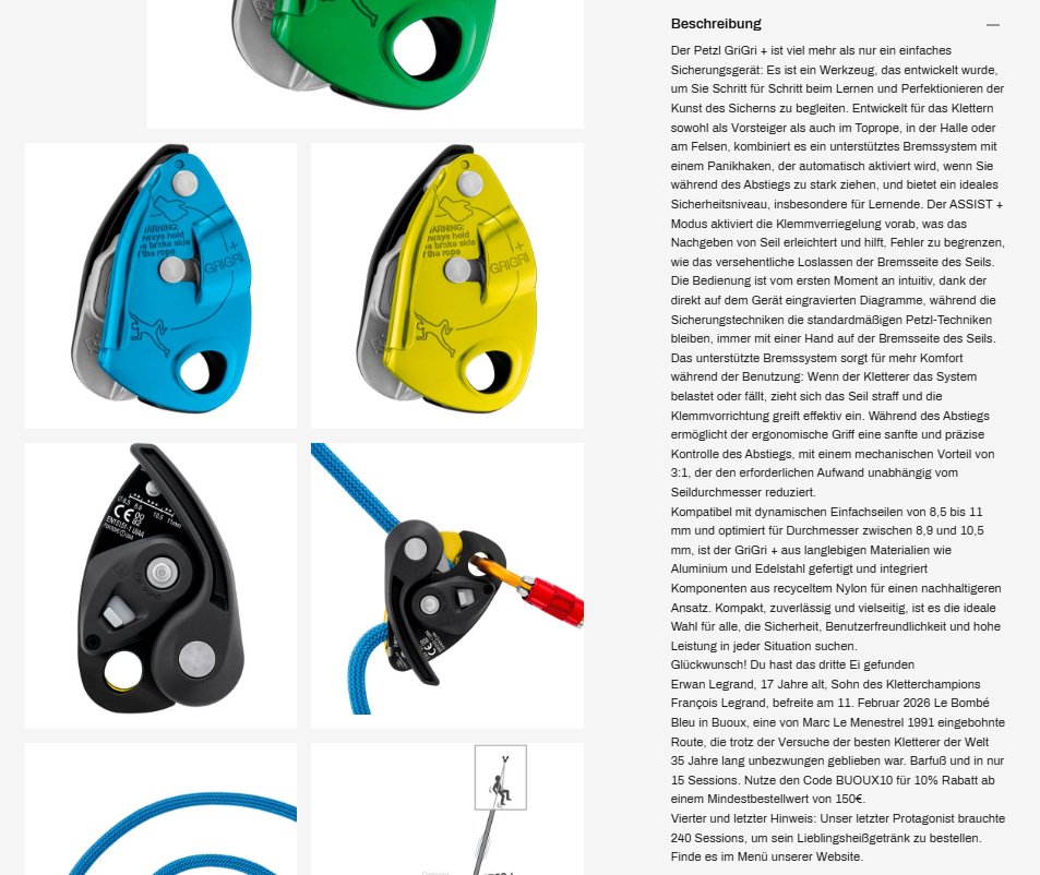Der dritte Hinweis beschrieb einen 17-Jährigen, der barfuß eine Route befreit hatte, die 35 Jahre lang unbezwungen geblieben war, und bat euch, an den Sichernden zu denken: hatte er die Gelegenheit gehabt, das neue Sicherungsgerät einer bekannten Marke auszuprobieren? Die Lösung war das Petzl Grigri+. Der Protagonist war Erwan Legrand, Sohn von François Legrand, der am 11. Februar 2026 Le Bombé Bleu in Buoux in nur 15 Sessions befreit hatte.