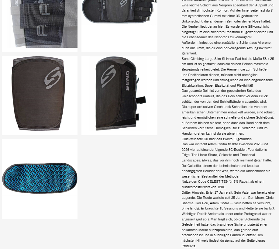 Auf der TC Pro-Seite versteckte sich der zweite Hinweis: ein Kletterer, der vier aufeinanderfolgende 8C-Boulder geflasht hatte und dabei zwei verschiedene Knieschoner trug. Die Lösung war das Send Large Slim knee pad, das Adam Ondra am rechten Bein bei Celestite trug, einem der technischsten und kneebar-abhängigsten Boulder der Welt.