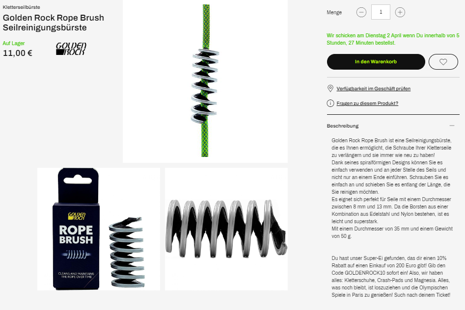 Der nächste Hinweis deutete darauf hin, dass wir unter den Produkten suchen sollten, die speziell zum Reinigen des Seils gedacht sind: Die Golden Rock Rope Brush ist die Bürste, die es Ihnen ermöglicht, die Lebensdauer des Seils zu verlängern, und Ihnen einen großzügigen Rabattcode bietet!