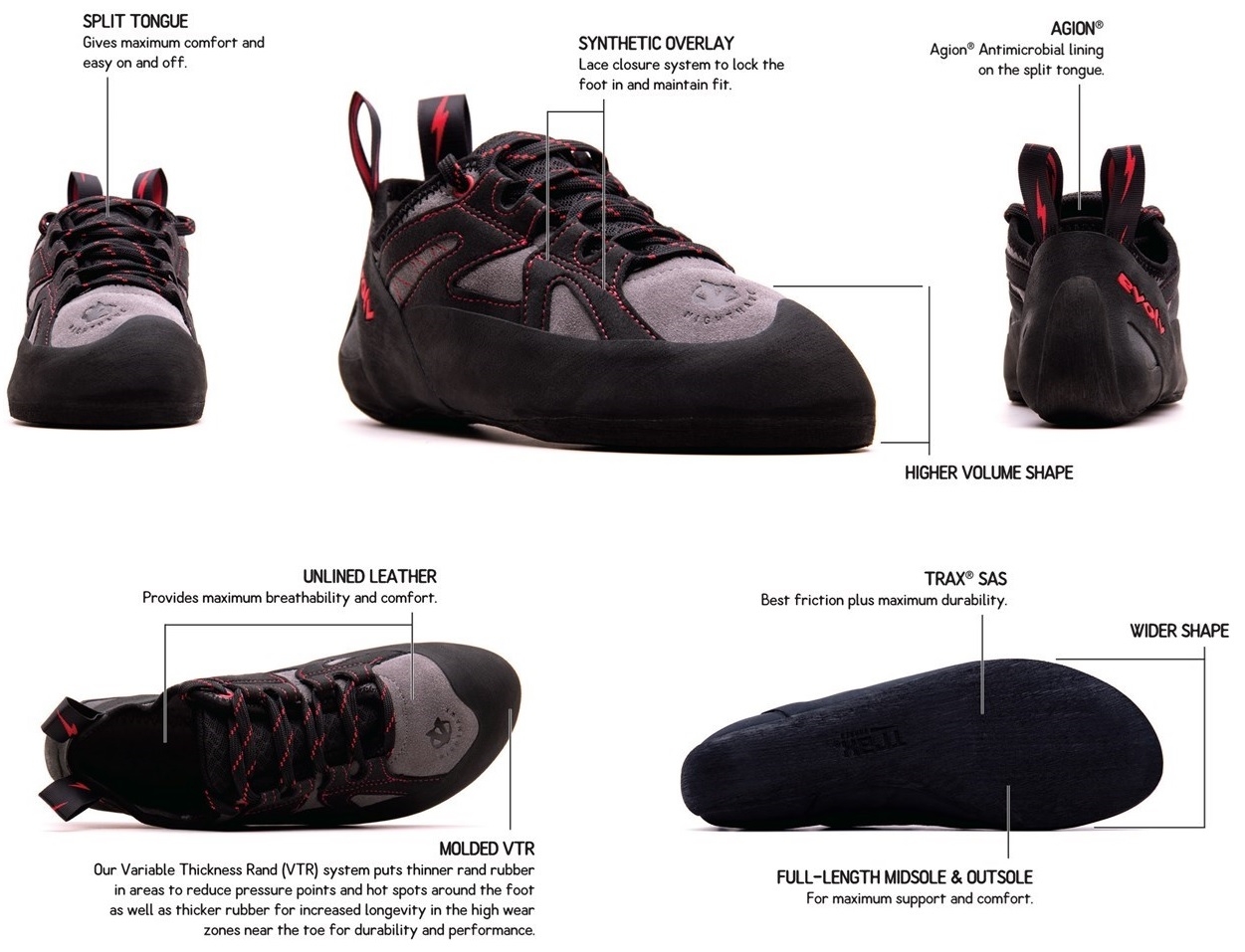 Die durchgehende, steife und schmale Sohle ist darauf ausgelegt, dir maximalen Halt auf kleinen Leisten zu bieten und besteht aus 4,2 mm Trax-Gummi, das dir außergewöhnlichen Grip und eine hervorragende Haltbarkeit garantiert! Das asymmetrische Profil sorgt zudem für eine gute Präzision!