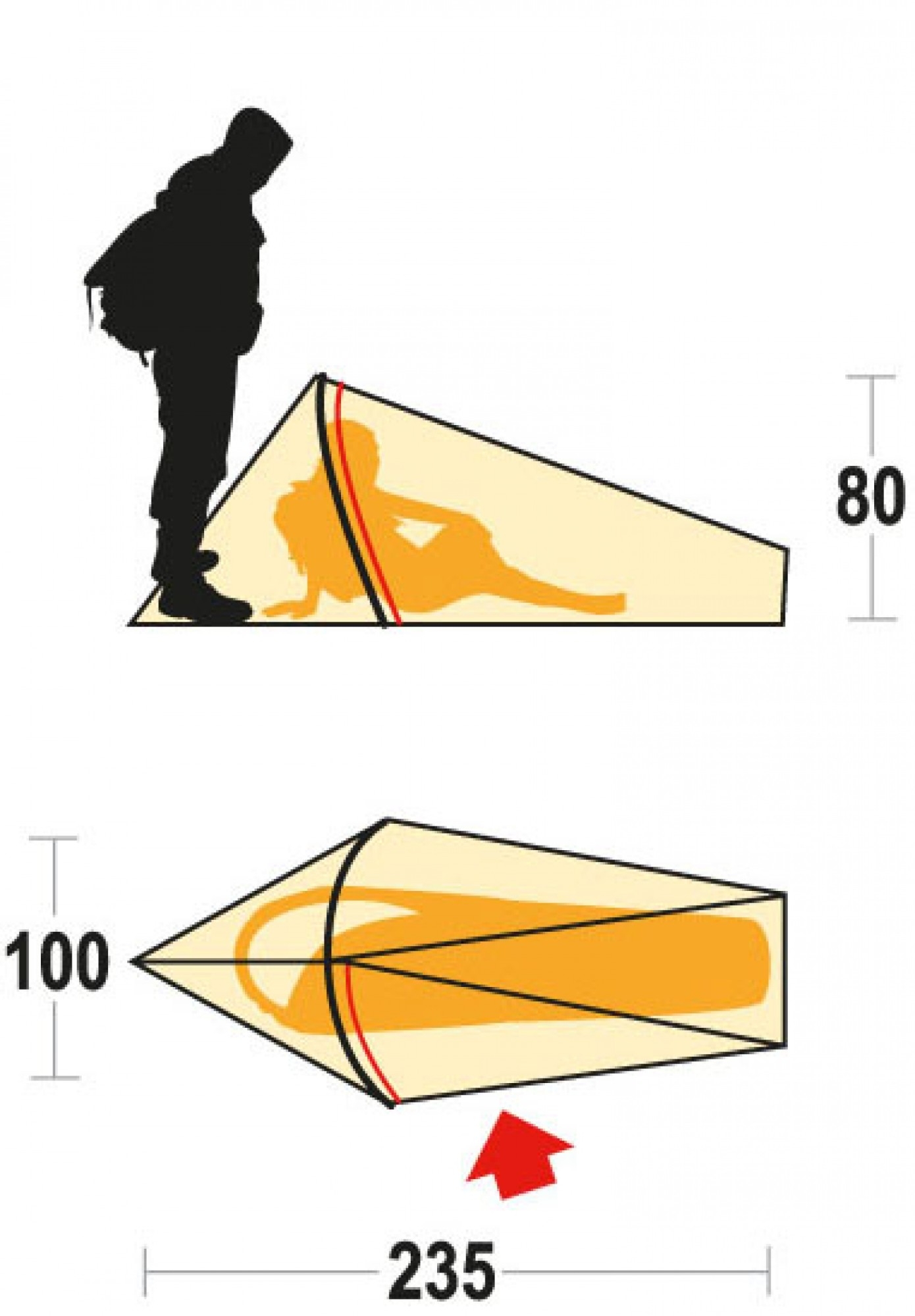 Das Zelt lässt sich dank der beiden unterschiedlich gefärbten Aluminiumstangen leicht aufbauen. Die Eingangstür mit Moskitonetz befindet sich seitlich, während die Belüftung vorne angebracht ist.