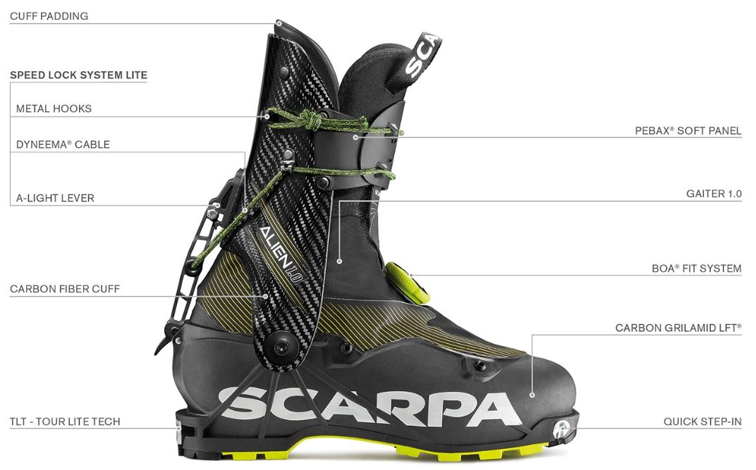 SCARPA Alien 1.0 ist ein Skischuh, der vor allem für Wettkämpfe konzipiert wurde. Daher ist er hervorragend für das Skitourenrennen sowohl vertikal (also ein super schnelles Rennen mit kurzen Distanzen) als auch für Langstrecken (Rennen mit längerer Dauer und mittellangen Distanzen).