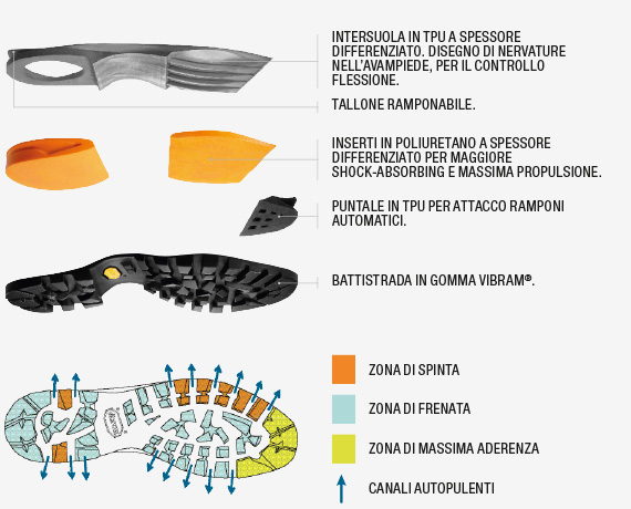 Er ist sowohl vorne als auch hinten steigeisenfest und somit mit allen automatischen Steigeisen kompatibel.