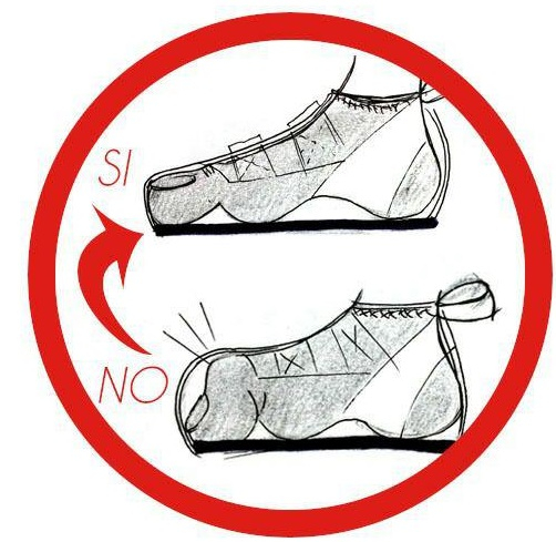 Der Komfort des Schuhs wird auch dadurch gewährleistet, dass er so konzipiert wurde, dass er hervorragenden Halt bietet, ohne dass man zu stark in der Größe abnehmen muss. Die Zehen sollten im Inneren gestreckt und nicht übermäßig gebogen sein.